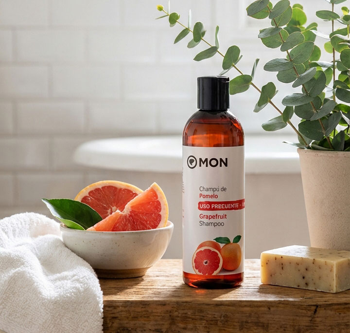 En MON formulamos el Champú natural de Pomelo pensando en quienes buscan eficacia real con ingredientes responsables. No se trata solo de aportar aroma, sino de aprovechar el potencial del pomelo en una fórmula equilibrada: